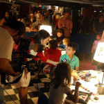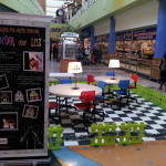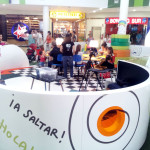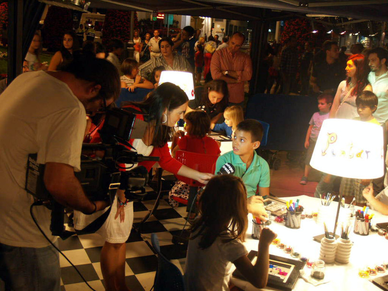 En los centros comerciales, las proyecciones pueden hacerse en pantallas de retroproyección, o bien sobre alguna superficie idonea del mismo centro. El niño pinta su dibujo, seguidamente se proyecta, y despúes se le da el dibujo para que se lo lleve a casa.